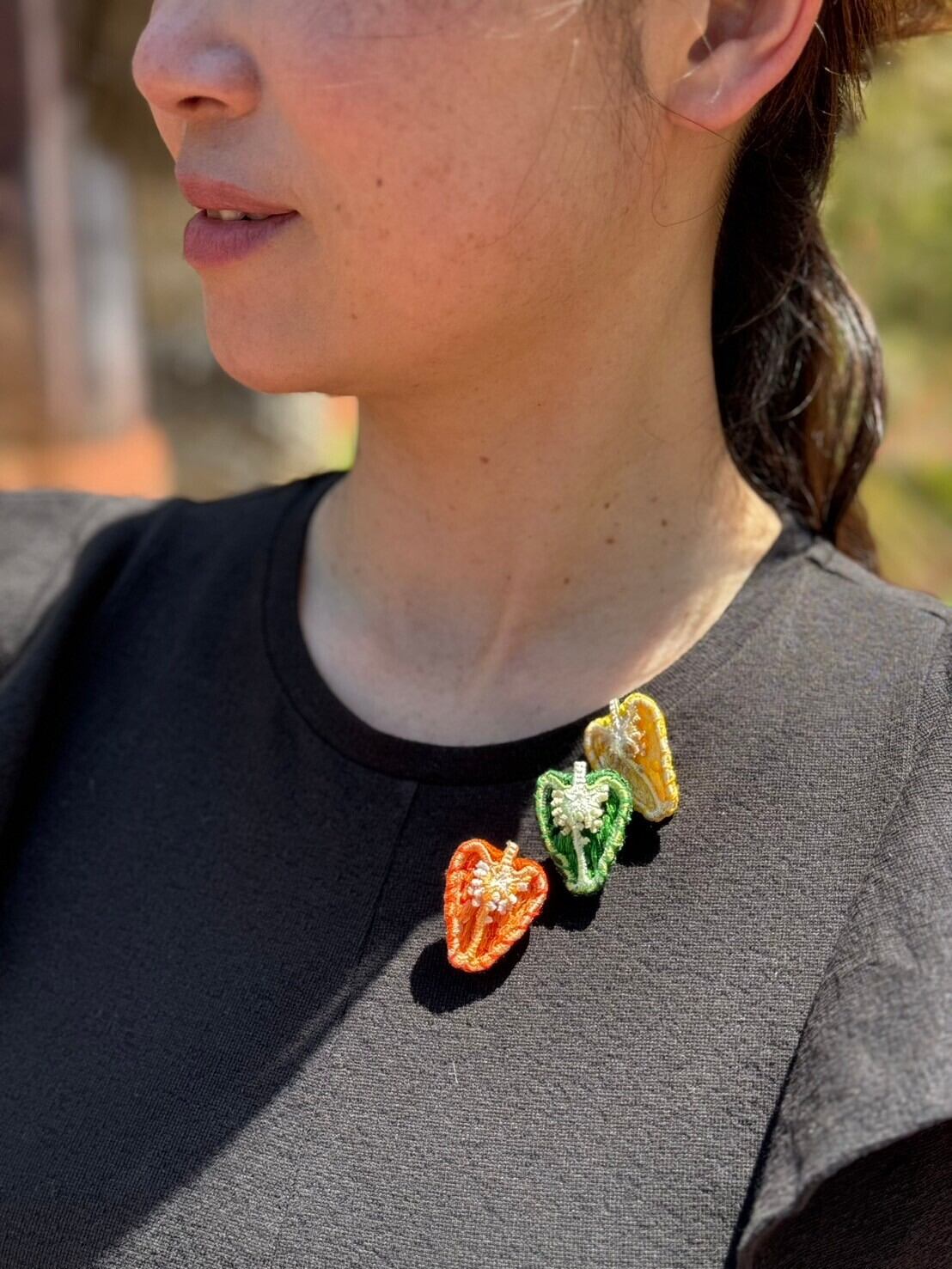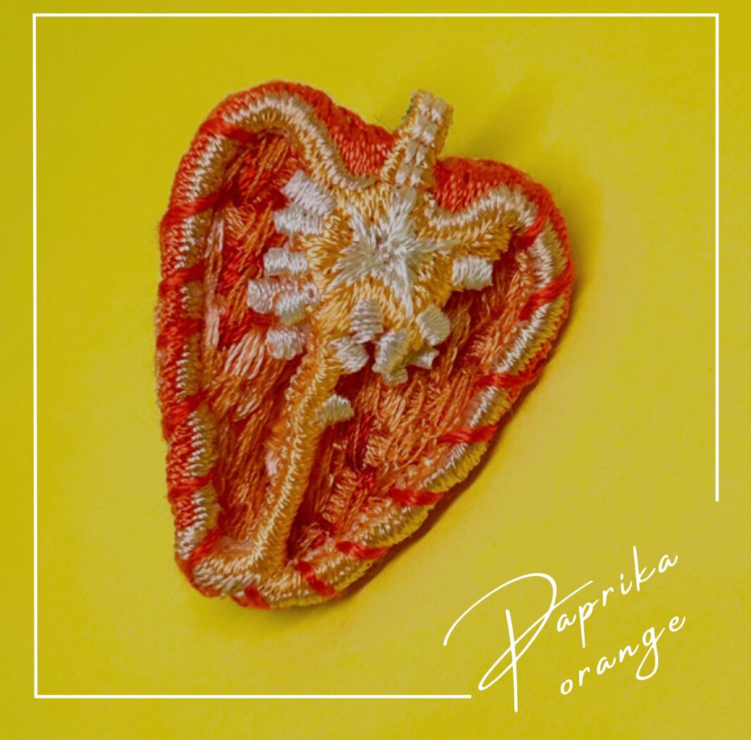 オレンジ色のビタミンカラーが楽しい気分にさせてくれるパプリカのおしゃれな刺繍ブローチ。じっくり見ると、ワタの部分や断面の凸凹感まで刺繍で細やかに表現されているんです♬ シャツやバッグ、帽子などに付けたら、更にお出かけが楽しくなりそうです♡