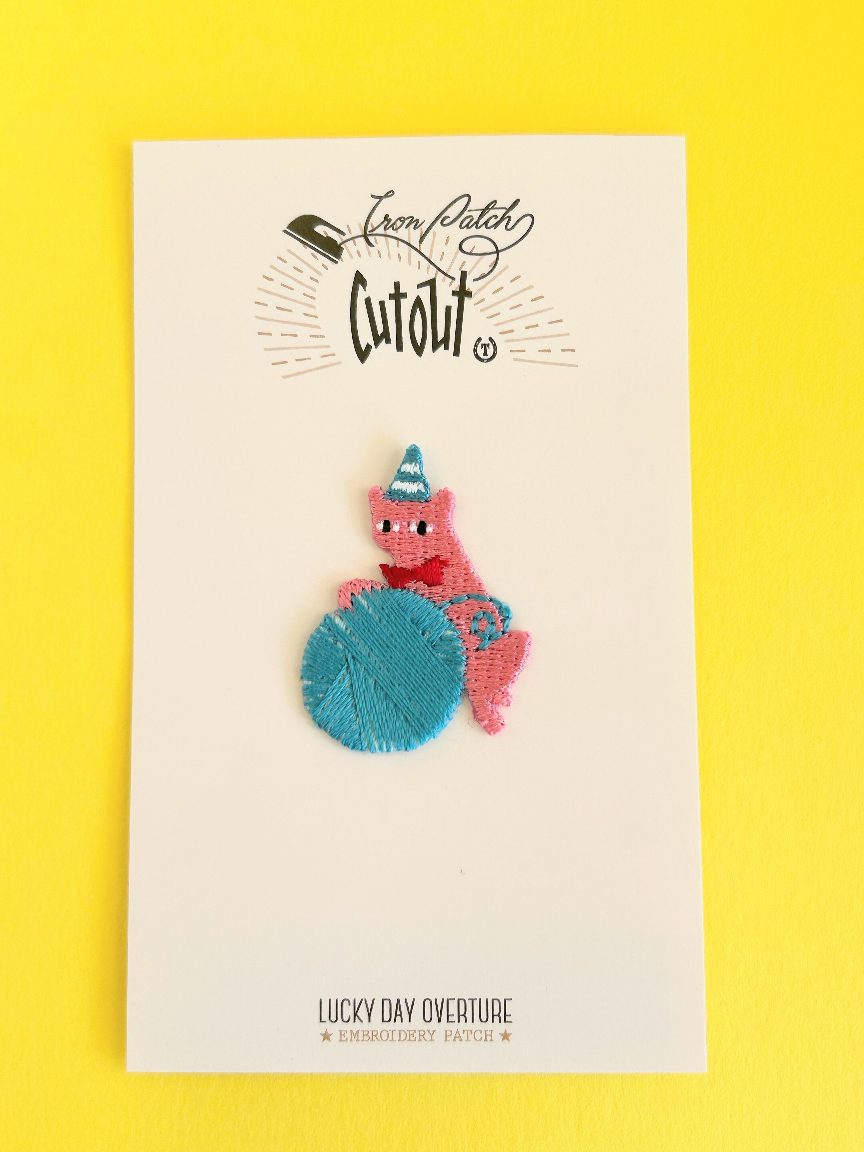 かわいい三角の帽子を被ったかわいい猫ちゃんのモチーフの「CUTOUT PINS」刺繍ワッペン。