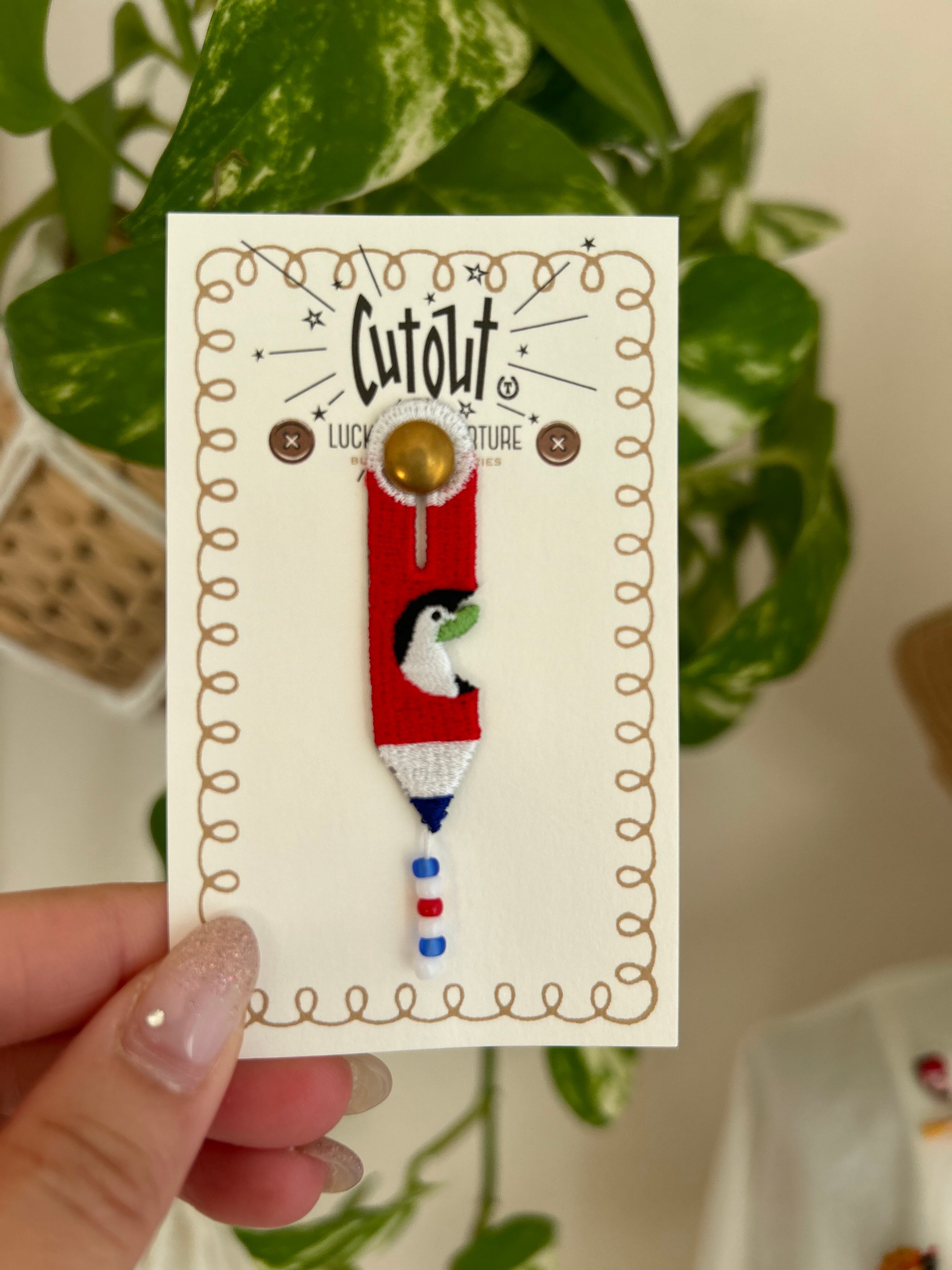 鉛筆をモチーフとしたボタンに引っかかるだけの簡単アクセサリー♡鉛筆の先に付いているビーズが揺れてとてもかわいいです♡色は3色♪どれも明るい色で、この季節のおでかけにピッタリです。