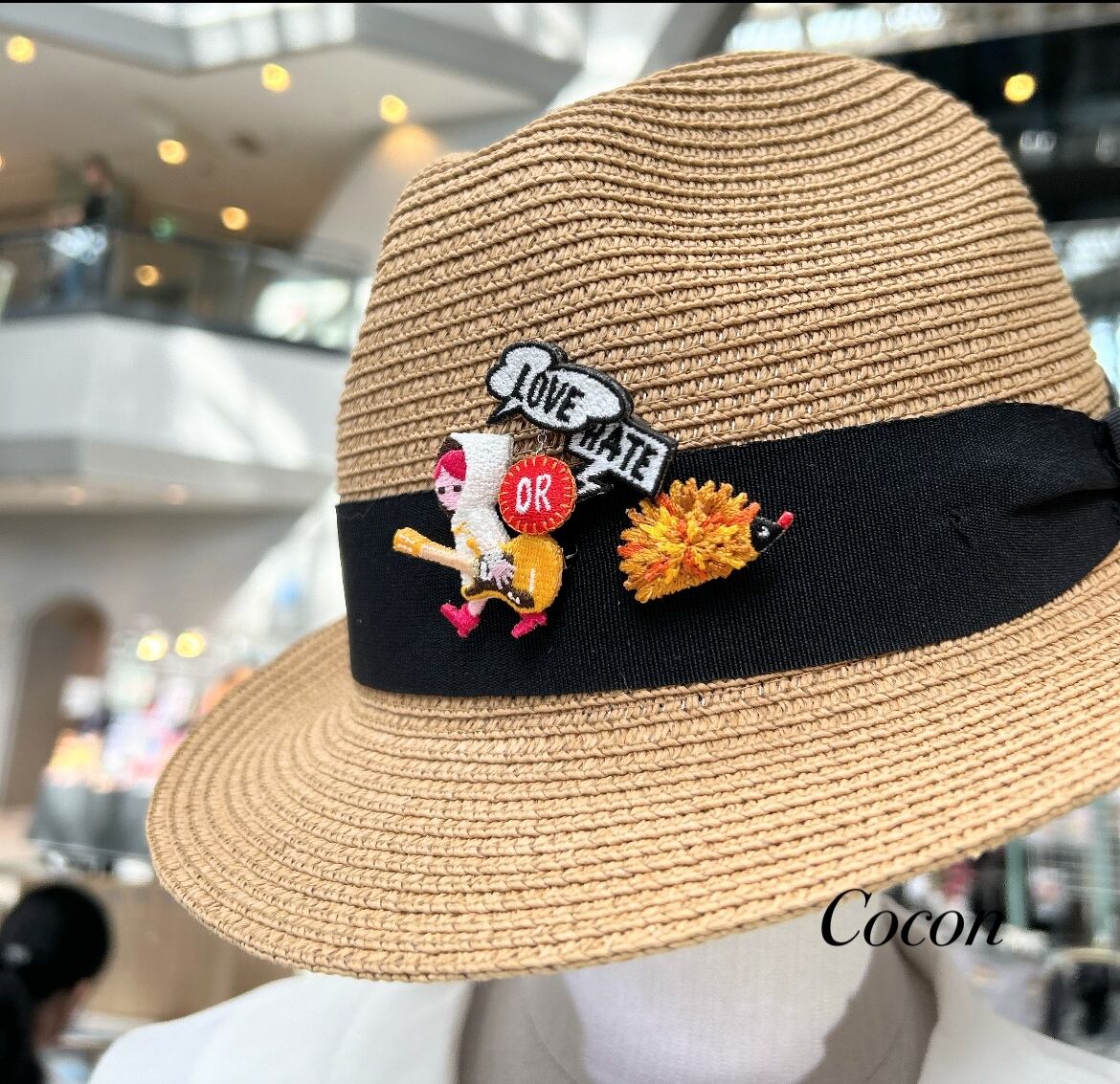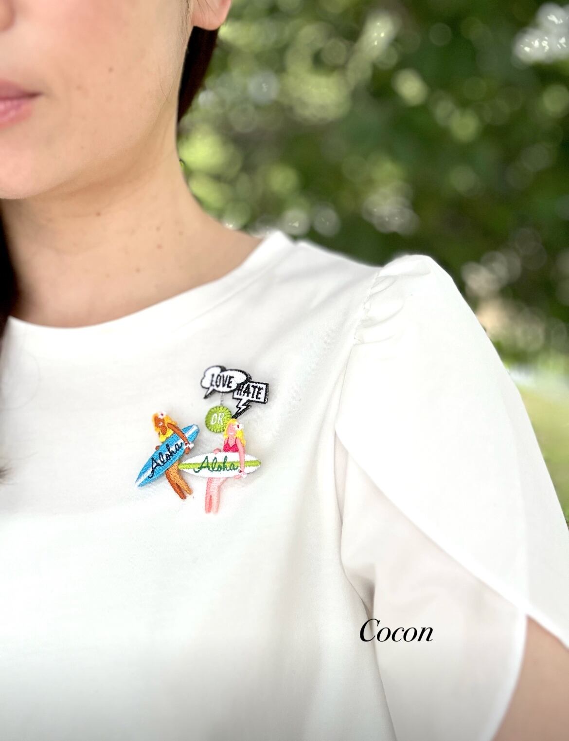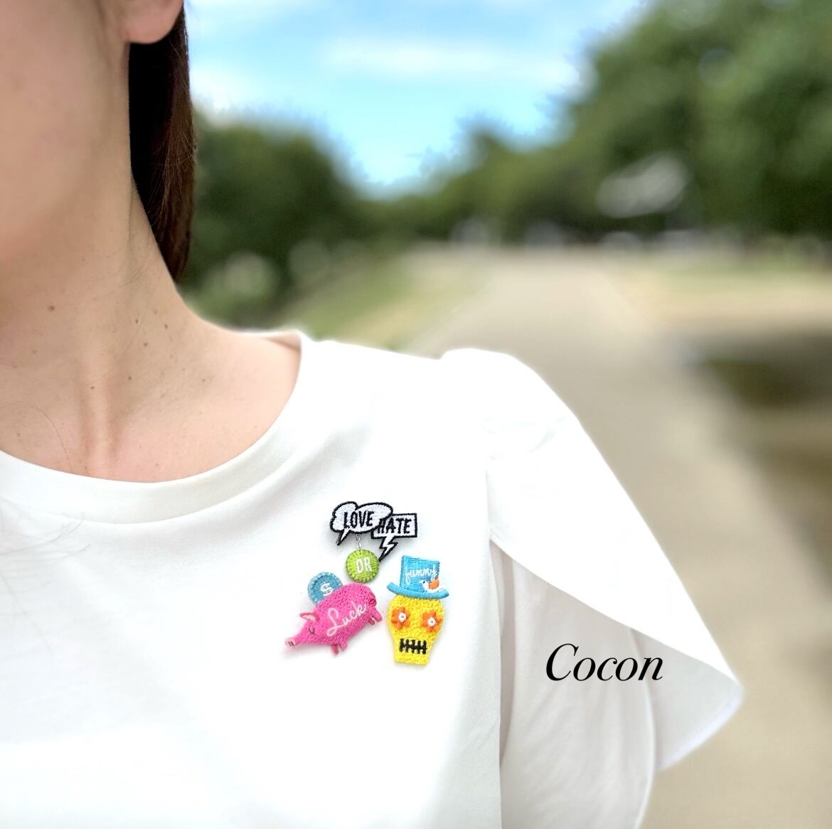「LOVE OR HATE」の吹き出しの立体刺繍ブローチ!他のブローチと組み合わせしやすく、オススメです。ORの文字は歩くたびにユラユラと揺れ、とてもかわいいですよ。色は3色のうちゴールドです。